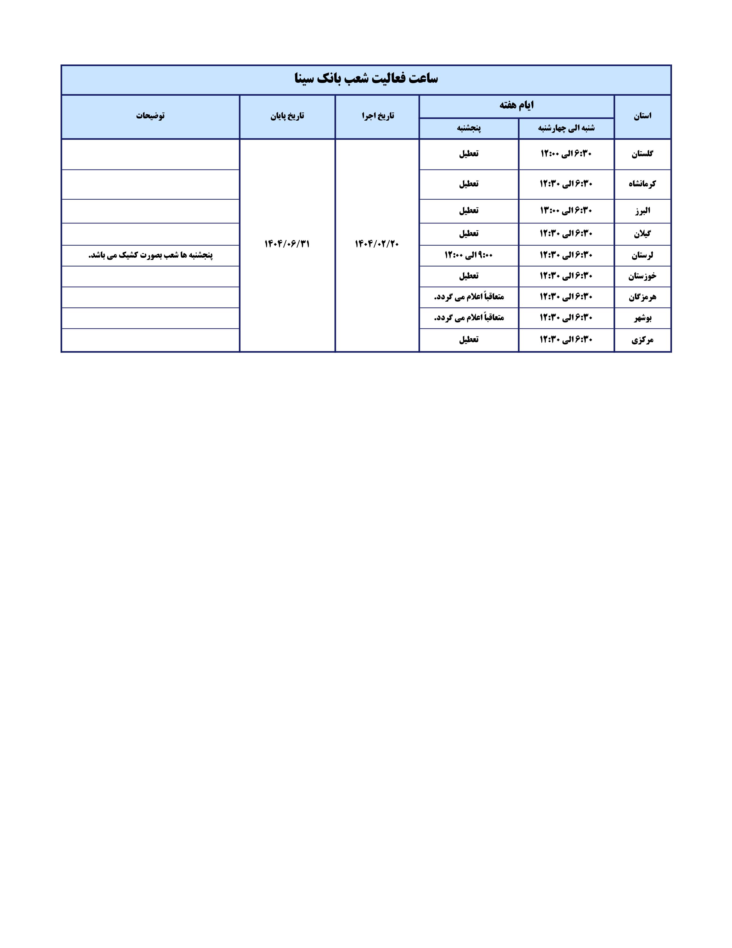 روزهای پنجشنبه نیز در تعدادی از این استانها تعطیل خواهد بود، جهت مشاهده جزئیات ساعت فعالیت بانک سینا در استانهای یاد شده اینجا را کلیک کنید.