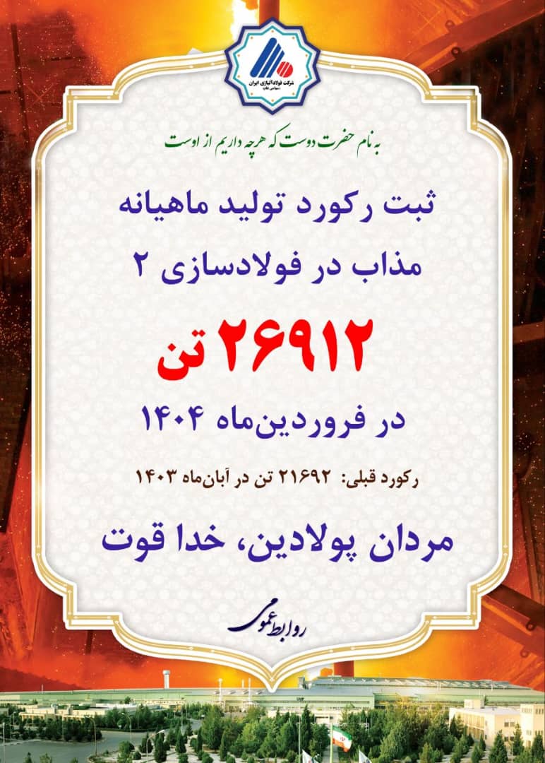 به گزارش تجارت گردان به نقل از روابطعمومی شرکت فولاد آلیاژی ایران، رکورد تولید ماهیانه مذاب به وزن ۲۶هزار و ۹۱۲ تن در فروردینماه ۱۴۰۴ برای کارخانه فولادسازی۲ به ثبت رسید.