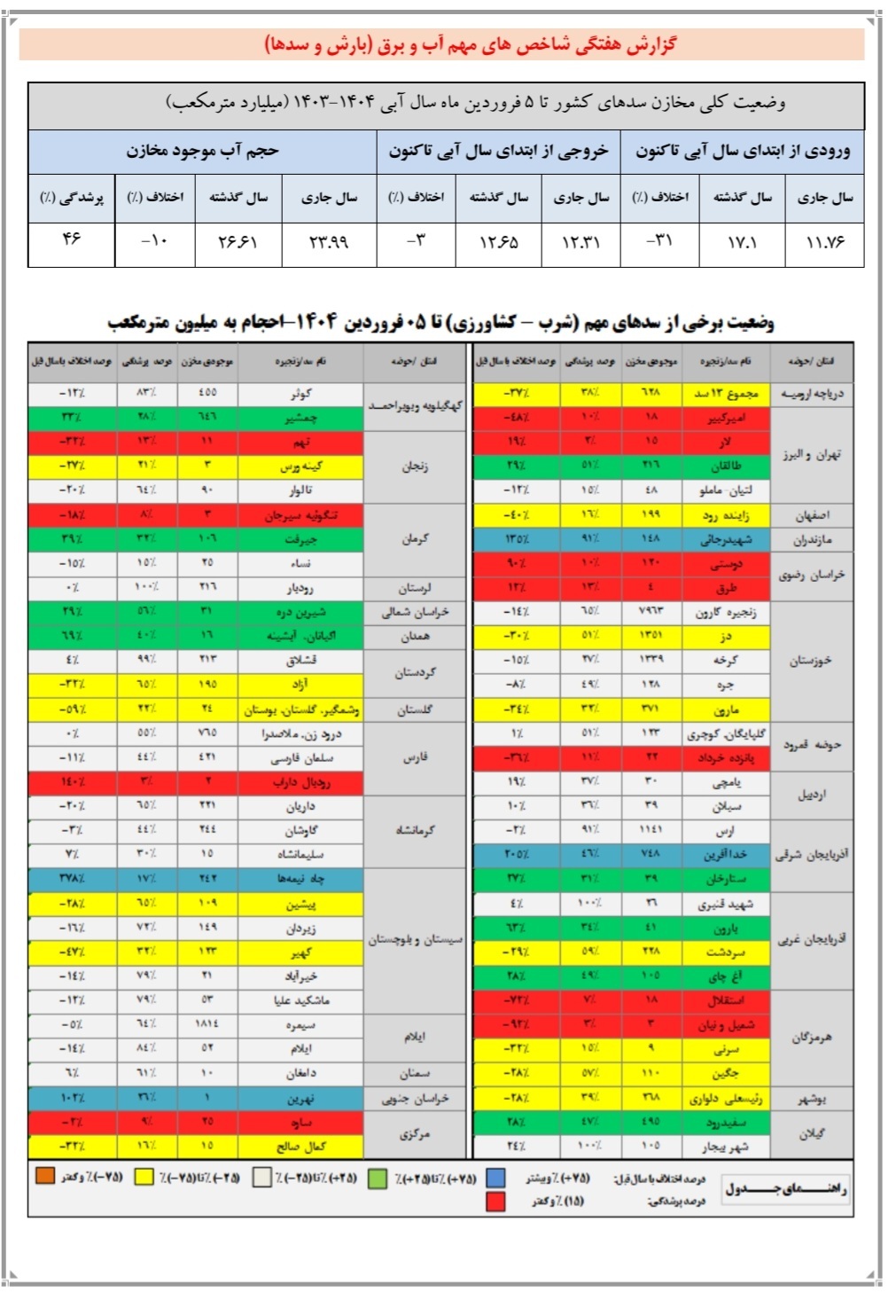 حجم آب موجود مخازن سدها بنابر بر آمار در حال حاضر ۲۳.۹۹ میلیارد متر مکعب است که نسبت به سال گذشته ۱۰ درصد کاهش یافته است. همچنین حجم پرشدگی سدهای کشور تنها ۴۶ درصد اعلام شده است.