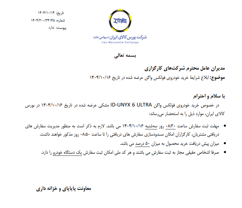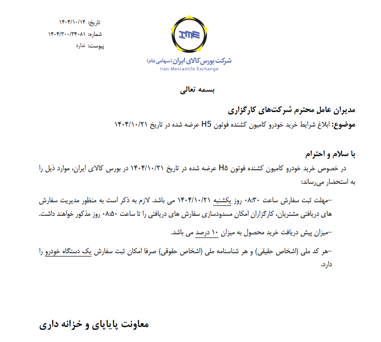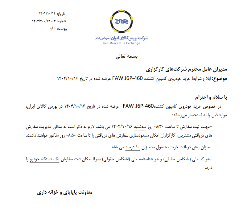 به گزارش تجارت گردان به نقل از کالاخبر ، در تالار خودرو بورس کالا فردا ۳۰ دستگاه کامیون کشنده فاو و ۳۰ دستگاه فولکس آی دی یونیکس اولترا عرضه می شود. همچنین در روز ۱۷ دی ۳۰ دستگاه ون فوتون وانا روی تابلو می رود و ۲۱ دی هم قرار است ۳۰ دستگاه کامیون کشنده فوتون عرضه شود.