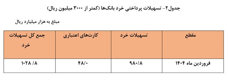 از کل تسهیلات پرداختی در دوره یاد شده، مبلغ ۹۸۰٫۸ هزار میلیارد ریال معادل ۸۲۲٫۸ درصد به صورت تسهیلات خرد اعطا شده است. همچنین مبلغ ۴۸٫۰ هزار میلیارد ریال نیز در قالب کارتهای اعتباری انجام پذیرفته است، که با احتساب این مبلغ، کل تسهیلات پرداختی خرد (کمتر از سه میلیارد ریال) به مبلغ ۱۰۲۸٫۸ هزار میلیارد ریال معادل ۲۳٫۷ درصد کل تسهیلات پرداختی را شامل میشود. شایان ذکر است با توجه به اینکه تسهیلات پرداختی در قالب کارتهای اعتباری نیز در بخش خانوار پرداخت شده است، با این اوصاف سهم بخش خانوار از ۲۲٫۸ درصد در جدول-۱، به ۲۳٫۷ درصد کل تسهیلات پرداختی افزایش مییابد.(جدول۲)